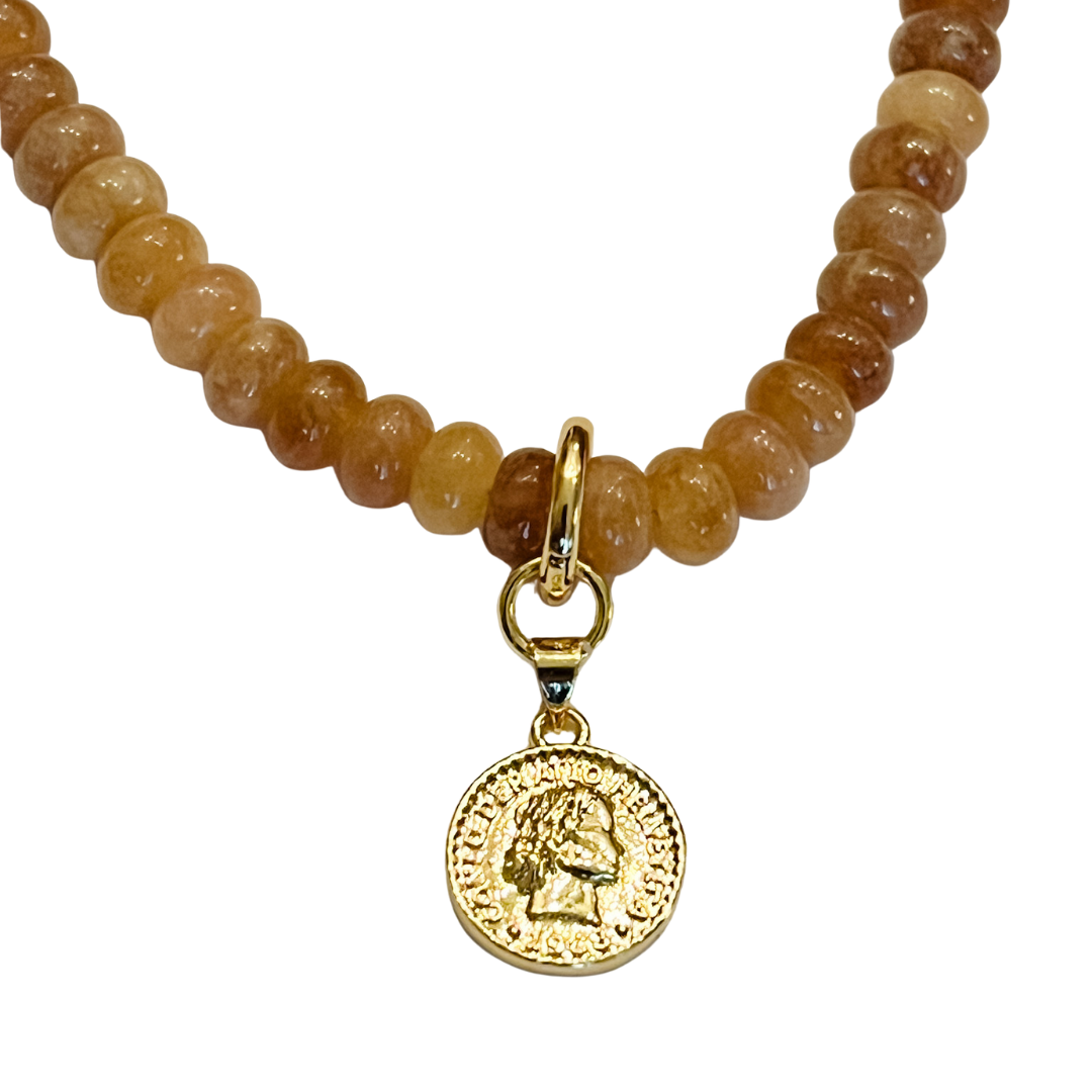 Gold-tone coin charm with antique finish hanging from a beaded necklace on a neutral background.