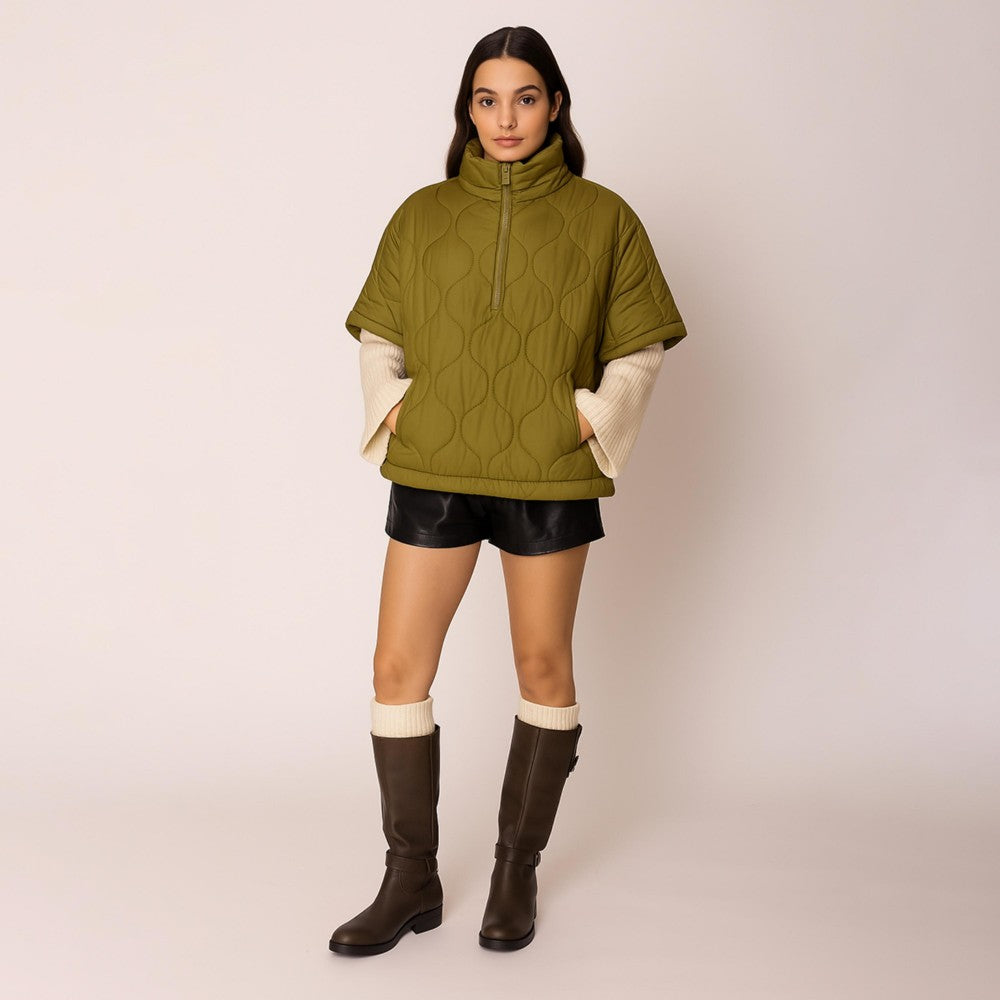 Woman wearing a striped sweater and denim shorts with a green cap on a gray background