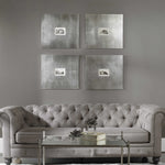 Set of four framed black-and-white architectural building prints with wide champagne silver leaf frames and light brown glaze, displayed in a grid