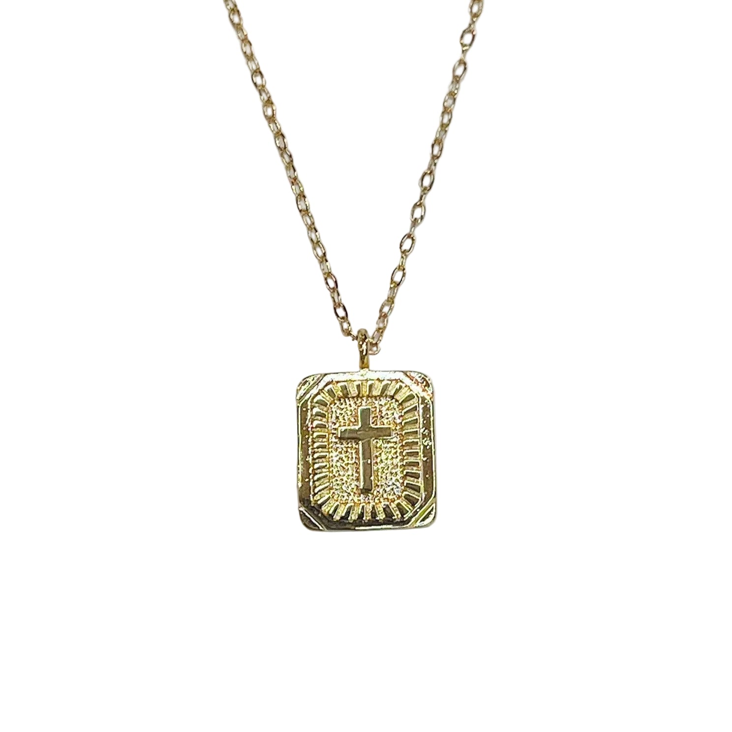 A gold-dipped necklace with a square pendant featuring a cross design.