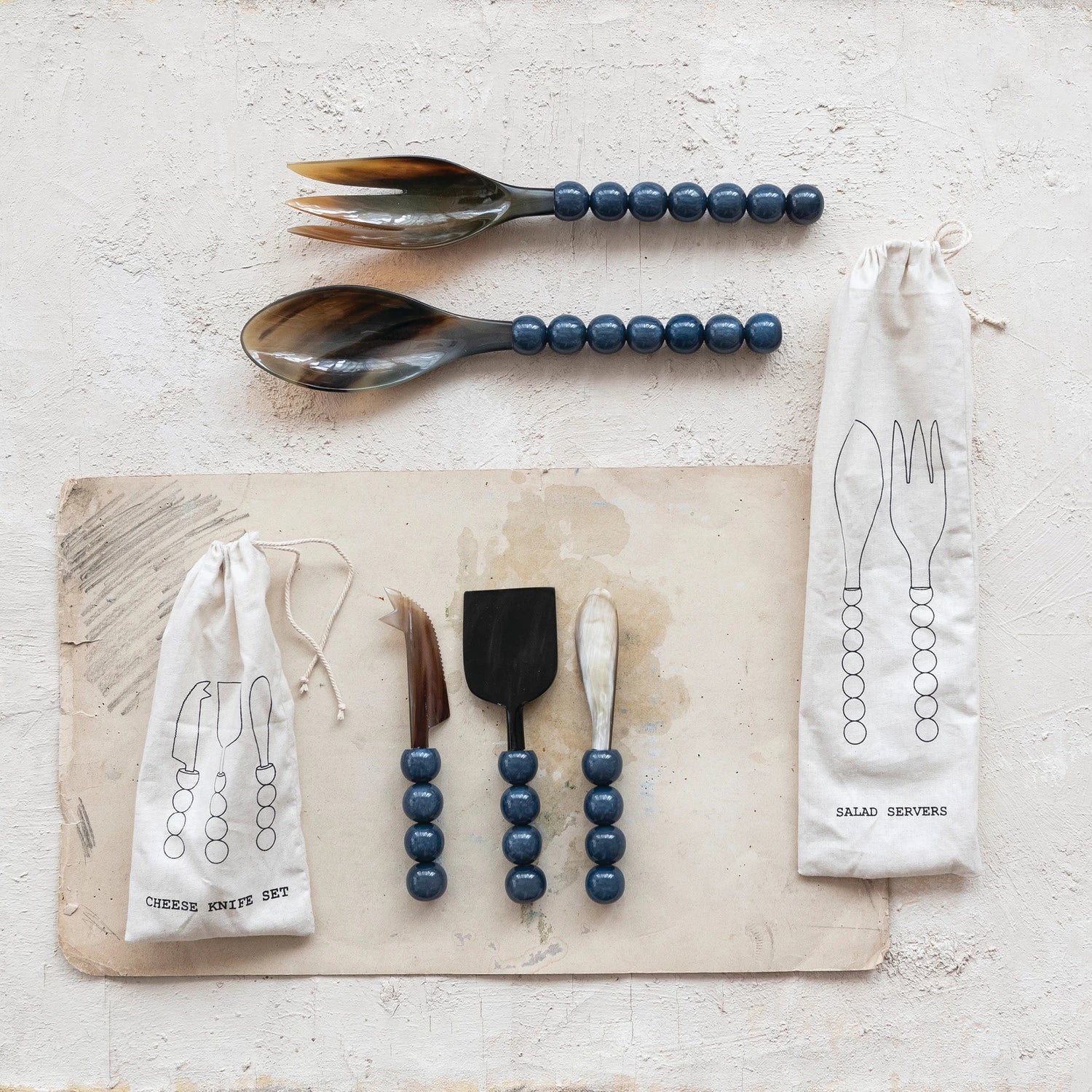 Set of salad servers with blue beaded handles on a light surface with packaging.