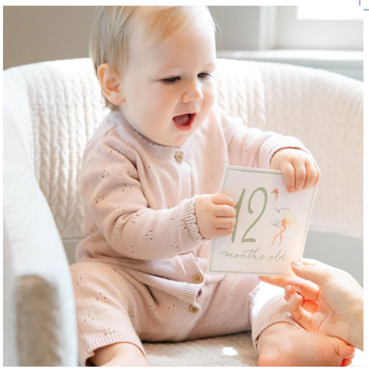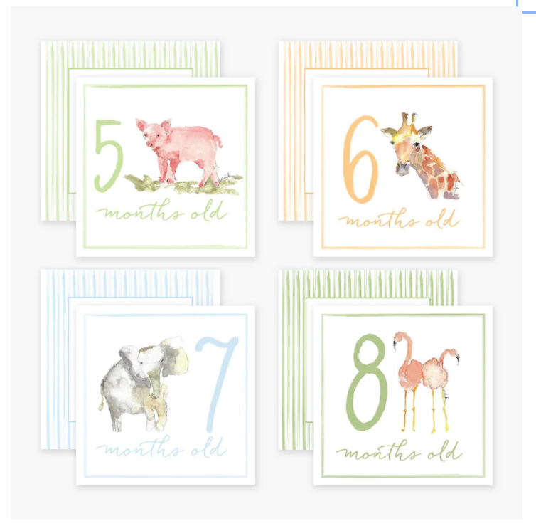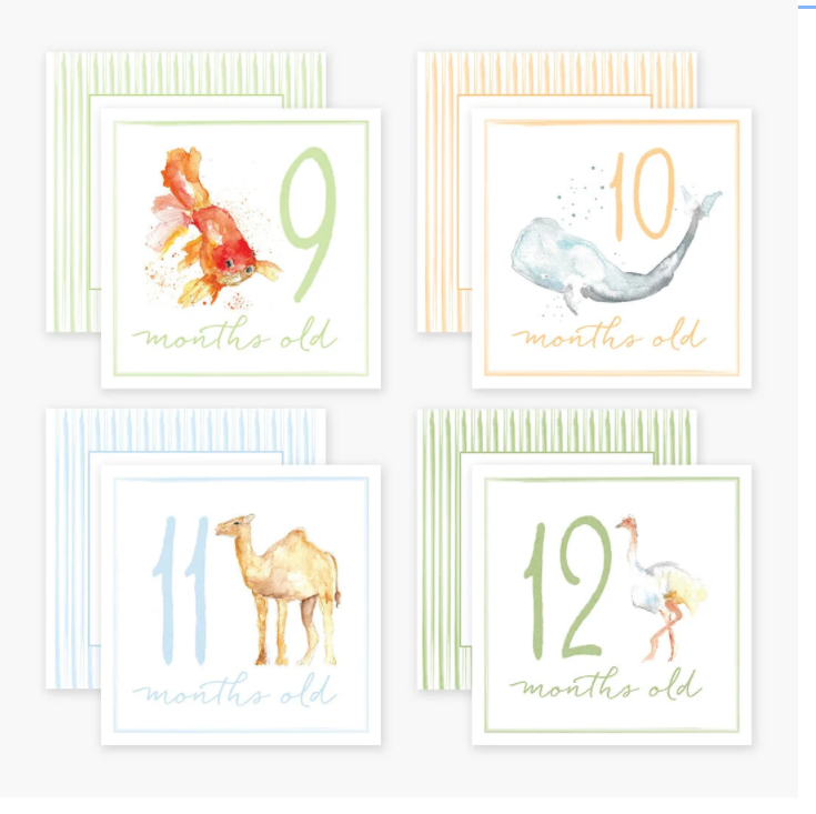 Our Milestone Cards feature artwork from Anne Neilson’s whimsical watercolor animal series, bringing a touch of fun and warmth to each special moment in your baby’s first year. Each card has a different animal and number of the month on one side, and a scripture verse on the other side, crafted to celebrate the unique milestones of your little one’s growth.