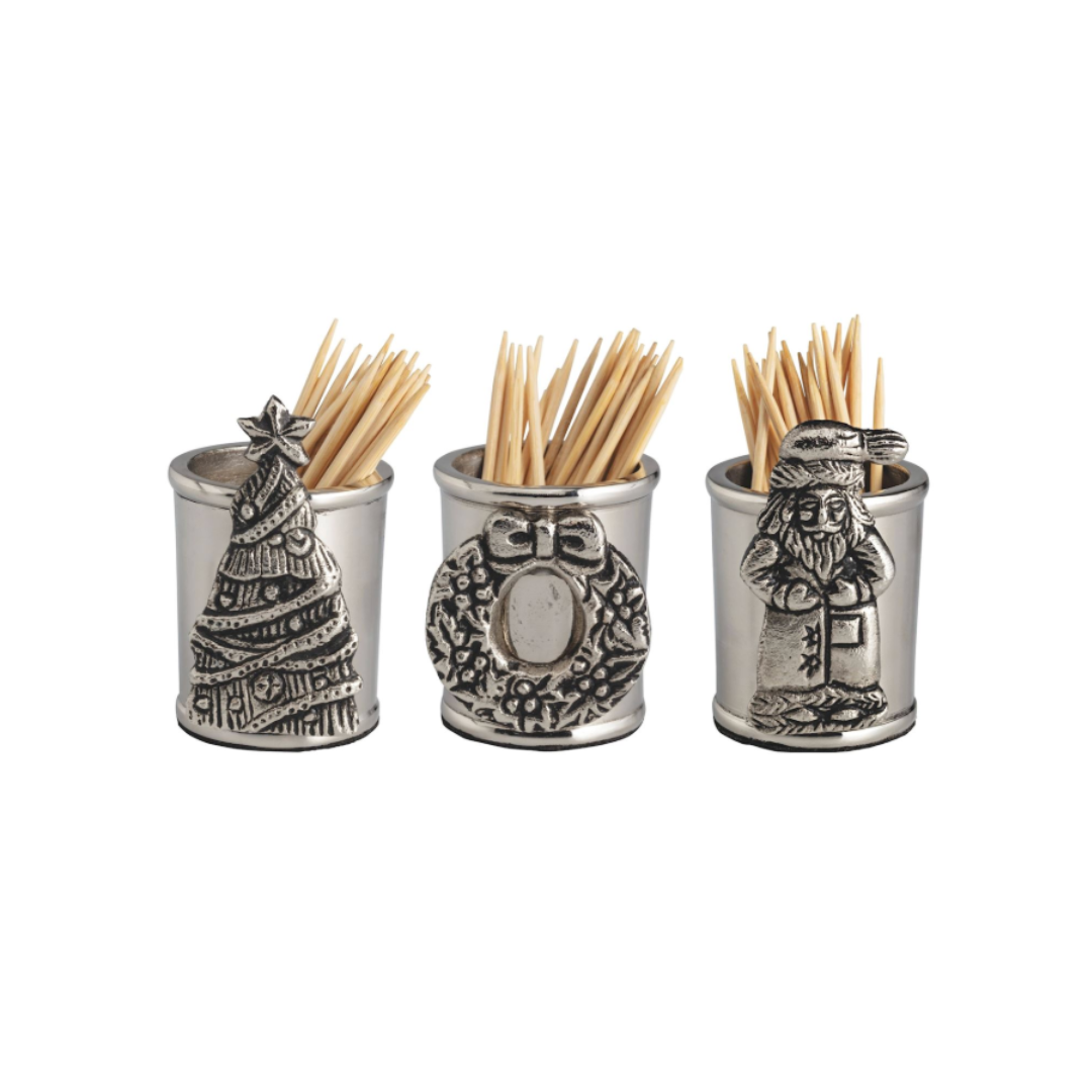 Elevate your holiday table setting with this charming Christmas Toothpick Holder. This delightful 2-piece set is crafted from durable cast aluminum, ensuring a long-lasting addition to your festive decor. The intricately designed holiday shape adds a touch of elegance and whimsy, making it a perfect centerpiece for your dining experience. Accompanied by a pack of wooden toothpicks, this caddy is both functional and stylish.  Ideal for holiday gatherings, this metal toothpick holder is a must-have for those who appreciate fine details and festive flair