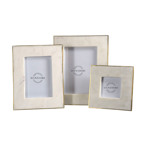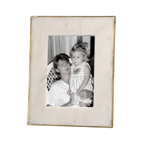 Showcase your favorite memories in style with the Dorothy Picture Frame. Expertly crafted from hand-carved white marble with soft gray veining, this frame exudes quiet luxury. A slim gold metal border adds a touch of warmth and modern contrast, enhancing its timeless appeal. The protective glass panel keeps your photo safe while offering a clear, polished display. Perfect on its own or as part of a curated frame collection on a tabletop or shelf, the Dorothy is where elegance meets everyday moments.