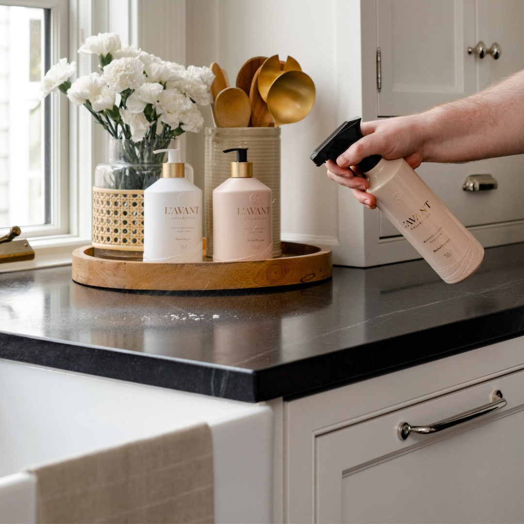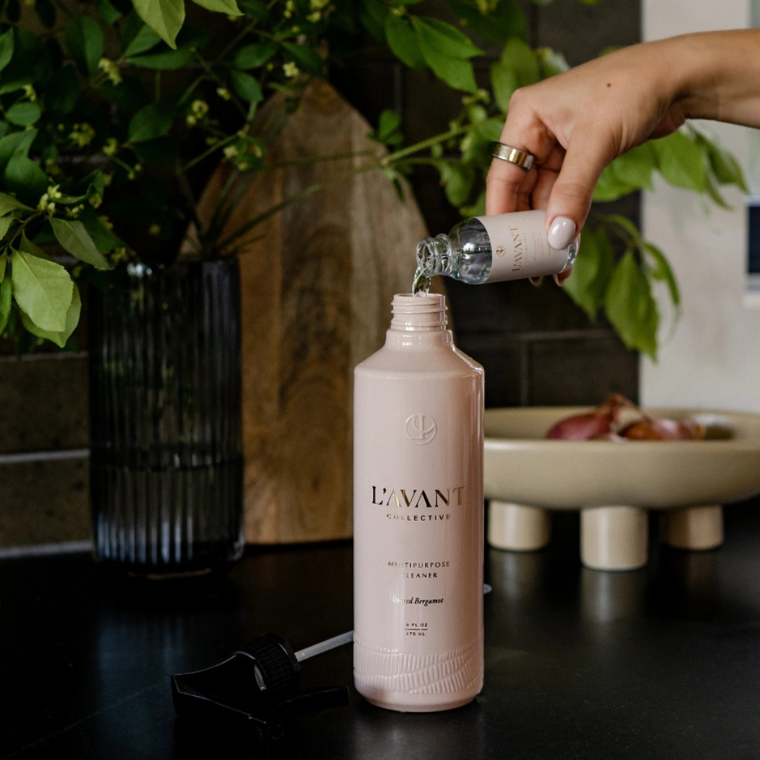 L'AVANT's high performing Multipurpose Surface Cleaner elevates the everyday chore of wiping down your surfaces, all while providing a powerful clean to remove grease, grime and the uninvited house guests living on your surfaces. Upgrade any counter - kitchen or bathroom - with our beautiful recycled plastic bottle and modern trigger sprayer that can be refilled again and again thanks to our amazing multipurpose concentrate.
