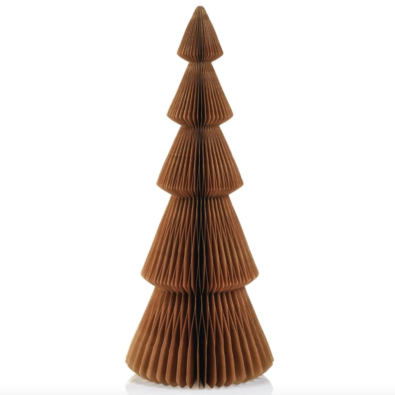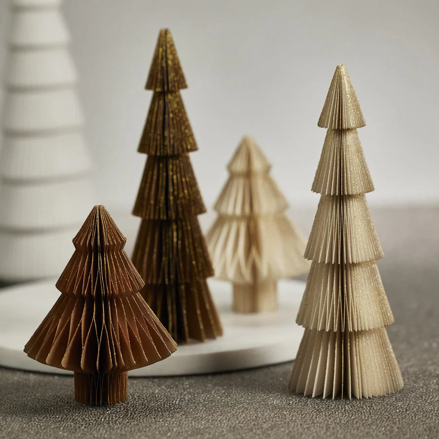 Paper comes full circle in this simply elegant forest of conifers. These accordion paper trees are handmade by skilled Indian artisans that give glamour to your Christmas decor. Each piece folds flat and expands to create perfect tree-shaped beauties that can stand on their own for a wintery touch of nature on any tabletop, mantel, or shelf. The best part is that they store flat, unlike typical trees.