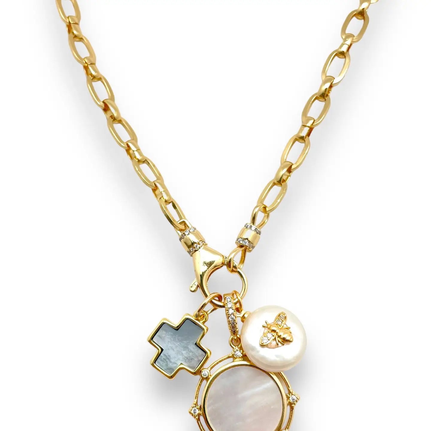 Timeless and luminous, the Mother of Pearl Charm adds a touch of effortless elegance to any necklace. Set in a gold-filled frame with delicate crystal accents, this charm is perfect for layering or wearing as a statement piece. The iridescent mother of pearl catches the light beautifully, making it a versatile addition to your favorite chain or charm collection.