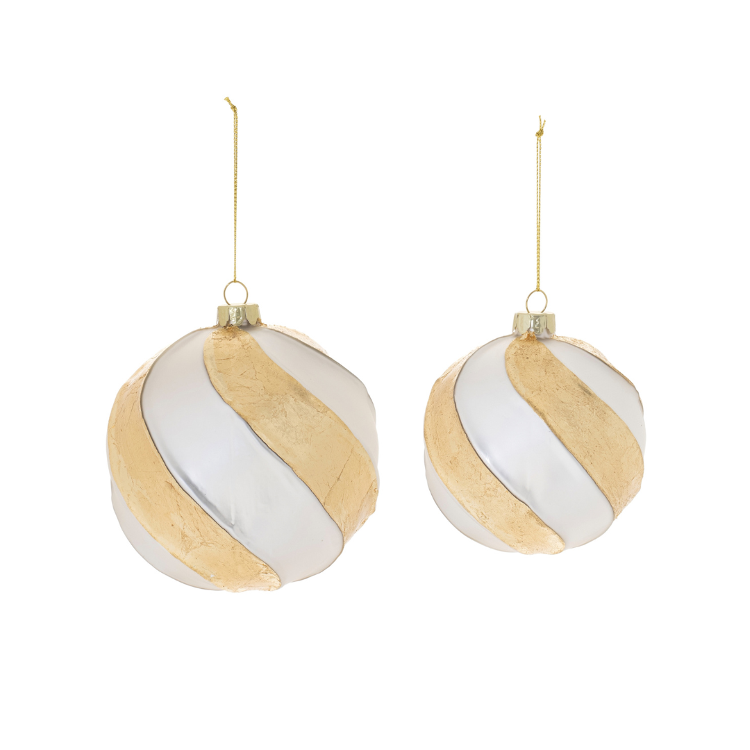 Elegant and timeless, the Dawson Ball Ornament adds a sophisticated touch to your holiday décor. Crafted from glass with a soft white finish and swirling gold accents, this ornament brings classic charm with a modern twist. Available in two sizes, it’s perfect for mixing and matching or creating a cohesive, elevated tree design.