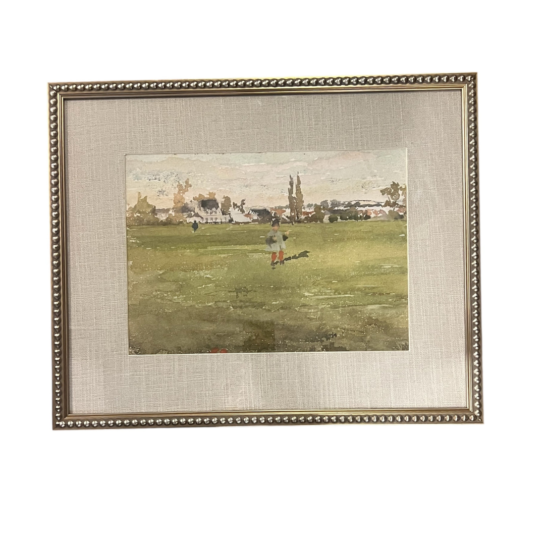 This vintage watercolor painting captures a peaceful pastoral scene with a wide stretch of green meadow and a lone figure standing at its center. In the distance, cottages and trees soften into the horizon under a muted sky, giving the composition a serene, timeless atmosphere. The loose, impressionistic brushwork and earthy color palette highlight the tranquility of open space and rural life. Finished with a linen mat and silver-toned beaded frame, this artwork brings understated elegance to any room.