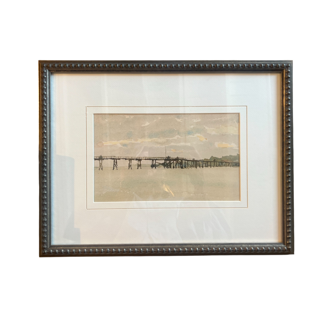 This vintage watercolor captures the quiet beauty of a seaside pier stretching gracefully into calm waters. Painted in muted tones of gray, blue, and soft beige, the piece evokes a tranquil coastal evening with subtle reflections dancing across the shoreline. The delicate brushwork and gentle color palette give it an airy, timeless quality, perfect for coastal-inspired interiors or anyone who loves maritime charm. Finished with a cream mat and silver-toned beaded frame, it’s an elegant artwork ready to display.