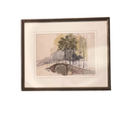 This vintage watercolor painting portrays a quiet countryside scene centered around a graceful stone bridge, shaded by tall trees along its edge. Muted tones of lavender, earthy browns, and soft greens blend seamlessly to evoke the gentle stillness of dusk settling over the landscape. The artist’s loose brushwork and airy palette capture both movement and calm, offering a timeless glimpse of rustic charm.
