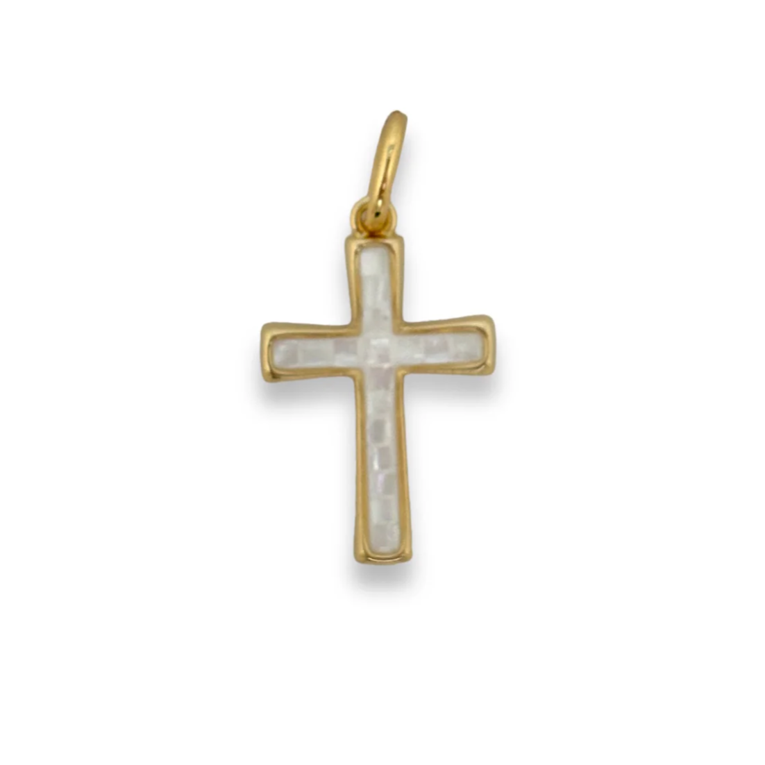 The Shell Cross Charm features a delicate gold cross outline with a luminous white shell center, blending classic symbolism with coastal elegance. Perfect for mixing and matching, this charm adds a meaningful touch to any personalized necklace or bracelet keepsake.