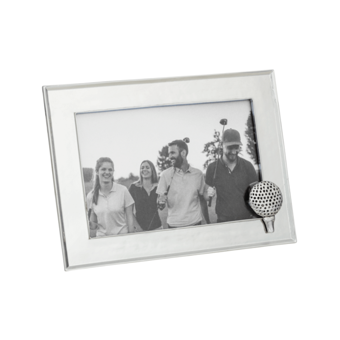 silver metal picture frame with golf ball and tee detail on a white background