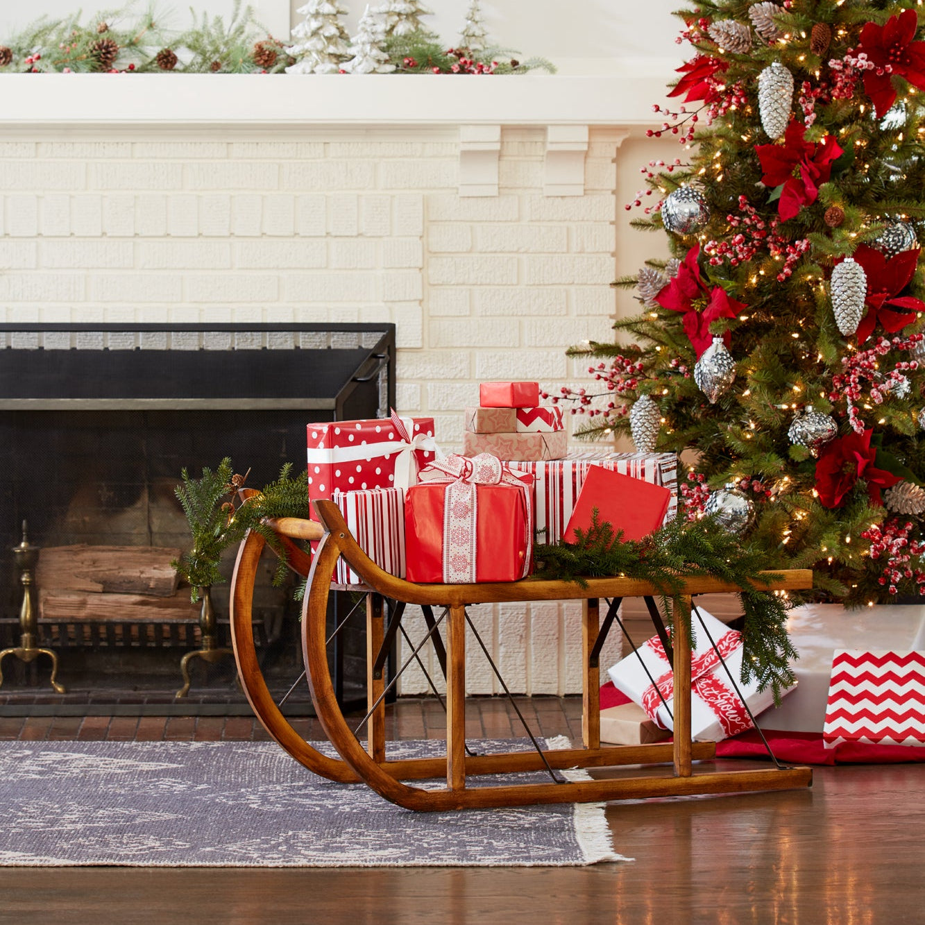 Christmas scene with a decorated tree, presents, and a wooden sled in front of a fireplace.